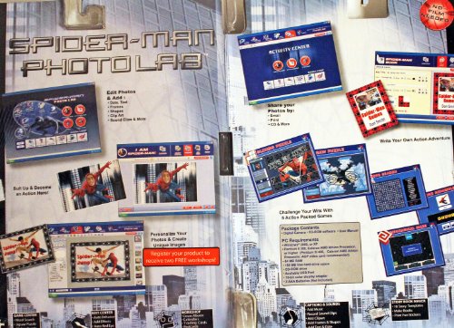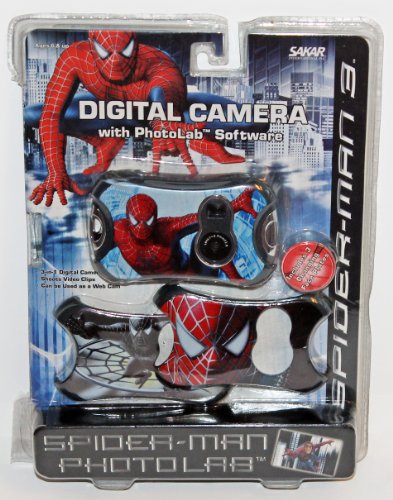 Spider-man 3 digital camera with Photolab Software allows direct download to computer and to edit/create unique photos. Comes with 3 interchangeable faceplates. Can be used as a web cam. Stores up to 200 pictures. Approx. 4 inches wide.Feature