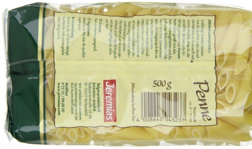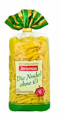 -. Binding : Lebensmittel & Getränke -. Brand : Jeremias -. EAN : 4008643043237 -. Feature : Genuss ohne Ei / die Alternative für alle, die bei ihrer Ernähung auf Ei verzichten möchten -. Label : Jeremias -. Manufacturer : Jeremias -. Model : 04823 -. MPN : 04823 -. NumberOfItems : 4 -. PackageQuantity : 4 -. PartNumber : 04823 -. ProductGroup : Grocery -. ProductTypeName : GROCERY -. Publisher : Jeremias -. Studio : Jeremias -. Title : Jeremias Penne, Pasta - Die Nudel ohne Ei, 4er Pack (4 x 500 g Beutel)