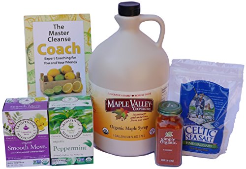 -. Binding : Health and Beauty -. Brand : Maple Valley / Organic Maple Cooperative -. Department : Health & Beauty -. EAN : 0765299000192 -. Feature : 1 gallon Maple Valley Cooperative Grade B Organic Maple Syrup in Bpa free packaging / 8oz Organic compliant Sea Salt - Selina Naturally and 2.89oz Cayenne - Simply Organic / 1 box Organic "Smooth Move" Laxative Tea and 1 box Organic Peppermint Tea - Traditional Medicinals (each box contains 16 tea bags) / Kit includes "The Master Cleanse " by Peter Glickman / Free Shipping. This kit does not contain lemons. You will have to buy your own lemons. -. IsAdultProduct : 0 -. Label : Maple Valley / Organic Maple Cooperative -. Manufacturer : Maple Valley / Organic Maple Cooperative -. MPN : MCKIT-GAL-3 -. PackageQuantity : 1 -. PartNumber : MCKIT-GAL-3 -. ProductGroup : Health and Beauty -. ProductTypeName : HEALTH_PERSONAL_CARE -. Publisher : Maple Valley / Organic Maple Cooperative -. Studio : Maple Valley / Organic Maple Cooperative -. Title : Maple Valley 16 Day Organic Master Cleanse Lemonade Detox/ Diet Kit with Book the Master Cleanse -. UPC : 765299000192