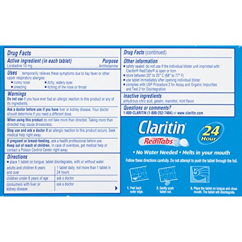 Claritin RediTabs provide powerful, 24 hour, non-drowsy relief of your worst indoor and outdoor allergy symptoms, including sneezing, runny nose, itchy/watery eyes, itchy throat/nose. Claritin provides relief of symptoms that can be triggered by over 200 different allergens. Claritin is an antihistamine, so it hinders the cascade triggered by allergens. Easy-to-take, orally dissolvable tablet, melts in mouth and requires no water. For adults and children ages 6 . One tablet contains 5mg of loratadine. 0 |