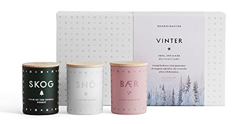 Studio : SKANDINAVISK Publisher : SKANDINAVISK Binding : Health and Beauty Product Description Crystal freshness, silent panoramas of evergreen and white, the irresistible allure of hibernation. Combining 3 of our most popular winter-oriented fragrances in a muted graphic display. BÆR : cloudberries, blueberries and lingonberries SNO: winter berries and frozen wood. SKOG: pine and fir, aged leather and woodland lily of the valley. Painted glass votives with a blend of perfume and vegetable wax with 100% cotton wicks and engraved beechwood lids. Designed in Denmark, assembled in France. 0