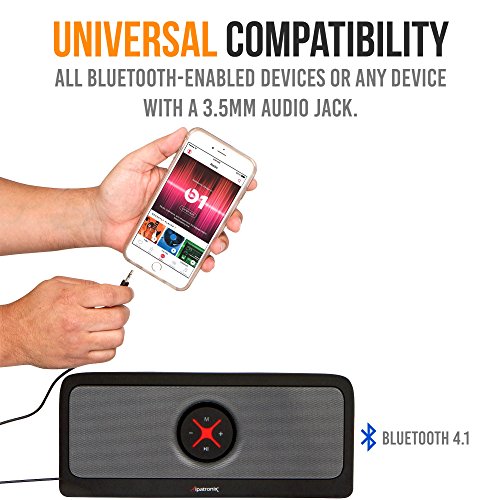HIGH DEFINITION SOUND: Provides stutter-free music streaming and seamless high definition audio up to 30+ ft. You can connect smartphone via Bluetooth, USB flash drive or auxiliary cable to play your favorite music, podcasts or videos. Two passive subwoofers are located on the right and left side of the speaker producing deep, enhanced bass. Compatible with the NEW Samsung Galaxy S8 & Galaxy S8+.