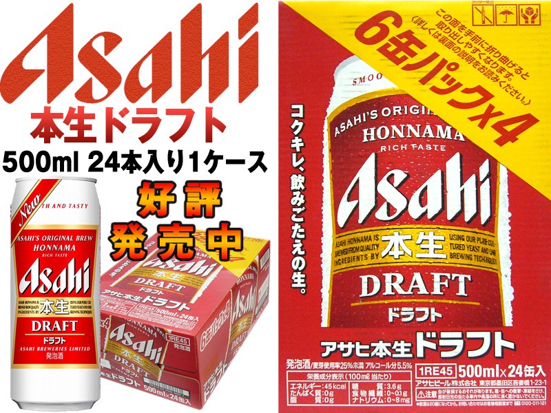 これぞコクキレ!飲みごたえの生!!アサヒ 本生 ドラフト 500ml×24本アサヒビールの定番発泡酒ブランド。コク・キレのジャストバランス」を高い次元で実現し、キレや泡品質はそのままに、コクや飲みごたえを強化することでこれぞ、コクキレ。飲みごたえの生。」に進化しました!2ケースまで1個口の送料で送れます。メーカー:アサヒビール株式会社酒類:ビール(発泡酒)原材料:麦芽、ホップ、大麦、大麦エキス、米、コーン、スターチ、糖類容量:500ml×24本アルコール度数:5.5%※箱、缶のデザインが変更になることがありますので、あらかじめご了承ください