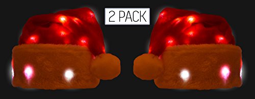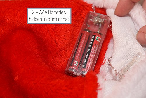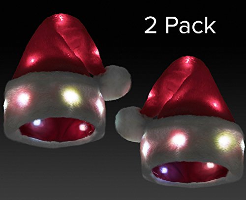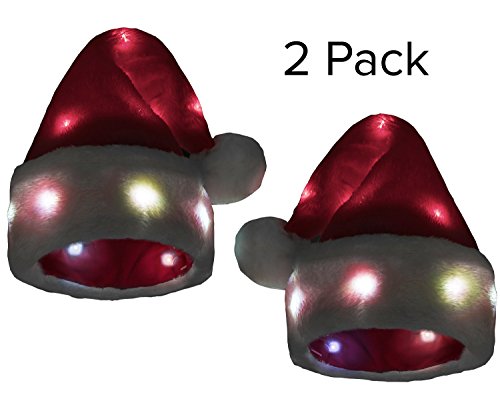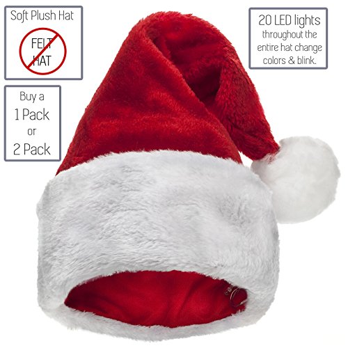 Product Description BE ORIGINAL Tired of dull co-worker parties, family gatherings and neighborhood hangouts? Light up the party with the Winks Novelty soft plush Santa hat with 20 blinking, color-changing LED lights. Impress your friends and family and give them a chuckle this Christmas. HOW IT WORKS A small switch on the battery cased inside the white brim turns the lights on and off. The lights fade on and off changing colors throughout the entire hat. The white brim and red cone, front and back; there are lights throughout the hat. Simply turn the lights off with the switch. LET'S TALK SIZE The hat size fits between 6-3/4 to 7, but has some give for larger heads. If you have a big head, wear it on the crown of your head. A small head (child)? Wear it over your ears. The size is as universal as possible without putting an ugly snap on the back. BATTERIES INCLUDED A box inside the brim houses 2 AAA batteries. You can pick these up at any store should you or somebody else forget to turn off the lights. Above all, have fun and be safe this Christmas season. 0
