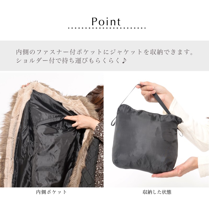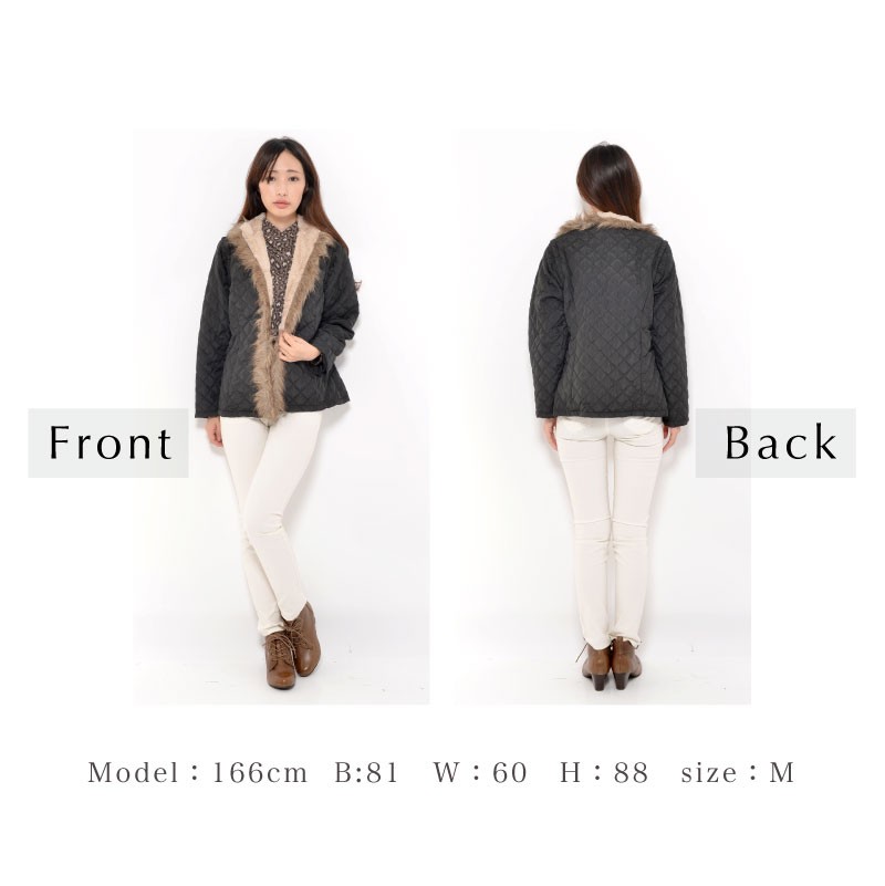 | 素材 | [本体]ポリエステル100% [中わた]ポリエステル100% [裏地]ポリエステル100% [ファー部分](衿端部分)アクリル75% ポリエステル25% (見返し部分)ポリエステル100% |