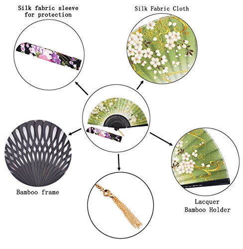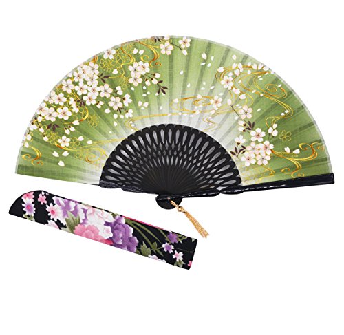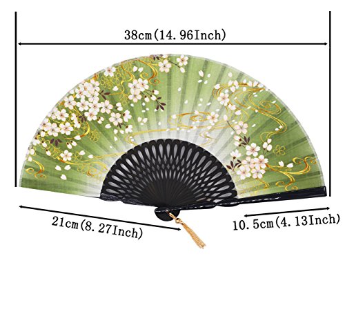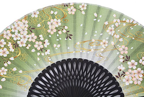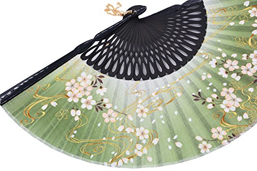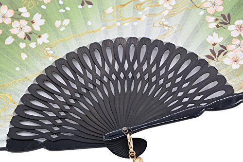 STHUAHE 8.27"(21CM) Sakura Convective Cloud Hand Painting Woman Folding Fans With a Fabric Sleeve for Protection,Hollow Carved Black Bamboo Frame Gift Fans Wedding Fan Dance Fan Craft Fan (Green)