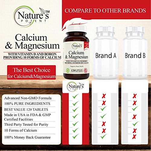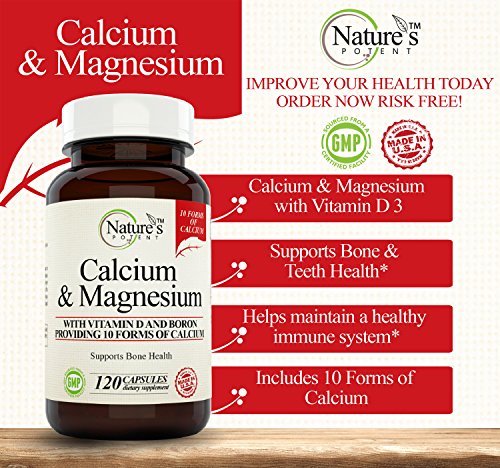 -. Binding : Health and Beauty -. Brand : Nature's Potent -. Color : Amber Bottle -. Feature : Nature's Potent - Calcium & Magnesium with Vitamin D 3 / Supports Bone Health* / Helps maintain a healthy immune system* / Includes 10 Forms of Calcium / Made in USA in NSF Certified Facilities *These statements have not been evaluated by the Food and Drug Administration. This product is not intended to diagnose, treat, cure or prevent any disease. -. IsAdultProduct : 0 -. Label : Nature's Potent -. Manufacturer : Nature's Potent -. MPN : CM-VL1114 -. PackageQuantity : 1 -. PartNumber : CM-VL1114 -. ProductGroup : Health and Beauty -. ProductTypeName : HEALTH_PERSONAL_CARE -. Publisher : Nature's Potent -. Studio : Nature's Potent -. Title : Calcium & Magnesium - With Vitamin D and Boron - Providing 10 Forms of Calcium - Offered by Nature's Potent