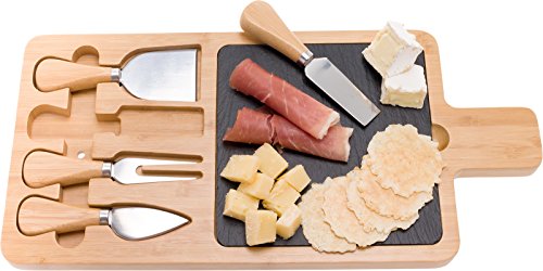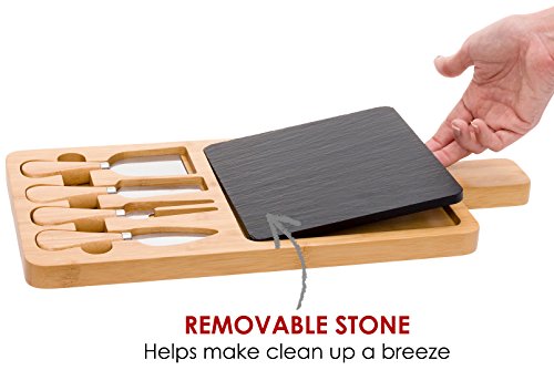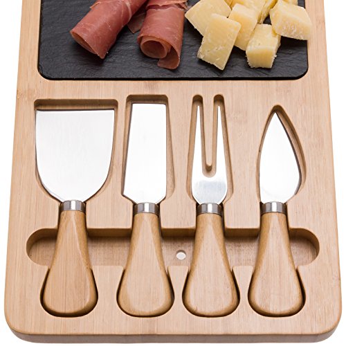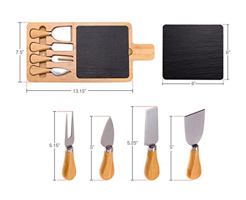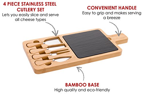 Studio : Mindful Design Publisher : Mindful Design Product Description Make presenting elegant meat, cheese or fruit spreads easy with the Bamboo Charcuterie Board and 4 Piece Cutlery Set by Mindful Design. Each serving tray comes artfully crafted from eco-friendly bamboo, natural black slate, and stainless steel, for a striking yet food safe display platter. The removable 6" x 6" slate insert is perfect for holding any type of meat or cheese, while the 4 stainless steel cheese knives make slicing and serving easy, and fit snugly into special grooves in the board for storage. An easy-to-grip handle on one side makes trips from the kitchen effortless. Best of all, once the guests have left and the party has died down, clean up is simple - just wipe the board and all pieces down with water, and occasionally treat with oil for maintenance. Perfect for everyday use or large get-togethers, this stylish serving tray makes an ideal addition to any host or hostess' tool set! Measures 13.15" x 7.5". 0