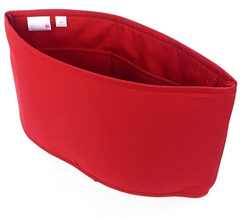 Product Description Measuring approximately 13" Long x 6" Tall, this flexible, oval shaped, bucket-style organizer goes from flat to about 3.5" wide at the bottom (in the center). At the top it can go up to about 7" wide at the center, it all depends on how much you fill it and how wide your bag is. The 13" length is given flat. When you fill the organizer the length will shrink to about 11.5" long. This organizer is a poly-nylon fabric, but underneath the fabric is interfacing to give it soft structure. The bottom is fabric only (no interfacing). There are pockets lining the inside of this organizer insert. All the pockets are 3.75" tall and come in the following widths: 3 pockets are 4", 1 is 3.75", 1 is 3.25", and 2 pen pockets about 1.75". All dimensions are approximate. These pockets are flat sewn with no gussets, but they will give a little over time. Please note that there is no velcro on these so they don't adjust in length, and there is no chance of them damaging delicate linings. Purse Bling Brand organizers are assembled and sewn in the USA! ***All organizers are use at your own risk. We are not responsible for any transfer of color onto your linings or items you carry in any purse organizer. It doesn't happen often, but we have heard of red dye rubbing off on phone cases and other light colored items. It is possible for very light colored linings to be damaged as well. Please choose your organizer color carefully to avoid any damage. Our liability is limited to the cost of the purse organizer. Any size suggestions are guidelines only and not guaranteed - depending on what you carry in your bag, and your preferences, you may like a different size than those suggested. ***Please note: Bottom trim color may not match body color exactly. Color can vary due to monitor differences, lighting, and dye lot or fabric changes. 0