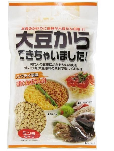 | 畑のお肉、大豆原料の素材をノンフライ製法で、ミンチ状にしました。お水戻し後、「ひき肉のかわり」として、そぼろ丼・ミートソースパスタ・ハンバーグ・麻婆豆腐やキーマカレーなど、アレンジでいろいろなお料理にご利用いただけます。 |