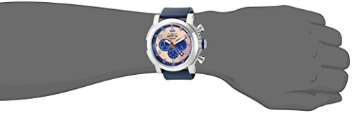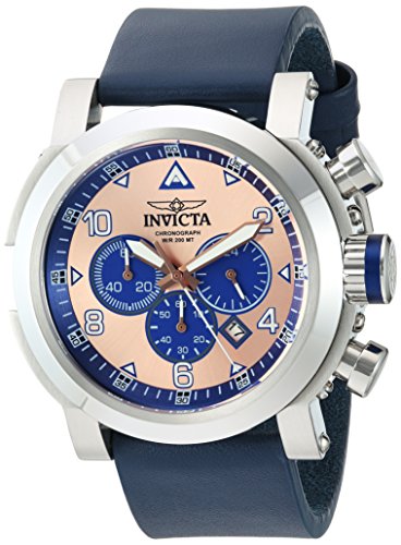 Generous in size with a 52 mm stainless steel case, this hefty I-Force timepiece from Invicta is made for the gentleman with daring tastes. The smooth, navy blue genuine leather strap complements the vibrant rose-tone dial with blue subdials, creating a handsome accessory that can enhance a suit and tie for the office or blazer and jeans for happy hour with the boys. This website is an authorized reseller of Invicta and each piece comes with the manufacturer warranty.Feature