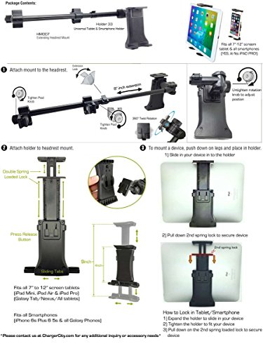 -. Feature : Compatible with all Smartphones & Tablets. Adjustable Size to fit all smartphone and tablet from 7" up to 12" with full accsess to all buttons and ports (ipad pro, ipad air, ipad mini, iphone 6s plus, iphone 6, samsung galaxy s7 S6 edge note lg g5 g4) / No special tools for installation, Easily attaches to headrest posts, Mount the headrest in seconds and transforms your tablet into a perfect in-car entertainment system / Telescopic arm can extand an extra 8 inches to allow customize Multi Passenger viewing / Easily attach & secure headrest mount on car seat without tools / ChargerCity Direct Replacement Warranty