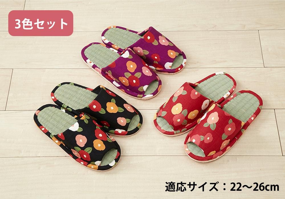 中敷にさらっと履き心地の良い、い草を使用。和風でレトロな椿柄です♪ 製造国:中国 素材・材質:生地:ポリエステル中敷:い草中材・底材:EVA樹脂 商品サイズ:全長:約26cm、ヒール高:約2cm 重量:片足:約80g 仕様:洗濯不可適応サイズ:約22~26cm セット内容:椿柄の3色セット(各1足)取扱説明書 ※サプライヤー直送品 ご注文後2~3営業日後の出荷となります【商品名】い草スリッパ つばき 3色組 XM-752