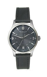 -. Feature : Victorinox Swiss Army watches live up to their name - Swiss royalty of watches / Features of this monochromatic black watch with silver accents include 12/24 military time, date window and sweeping second hand / Appealingly clean and simple watch is topped off with a scratch resistant crystal face / Soft and supple leather band perfect for anyone with sensitive wrists / Analog quartz movement for long-lasting accuracy, losing only a few seconds per month