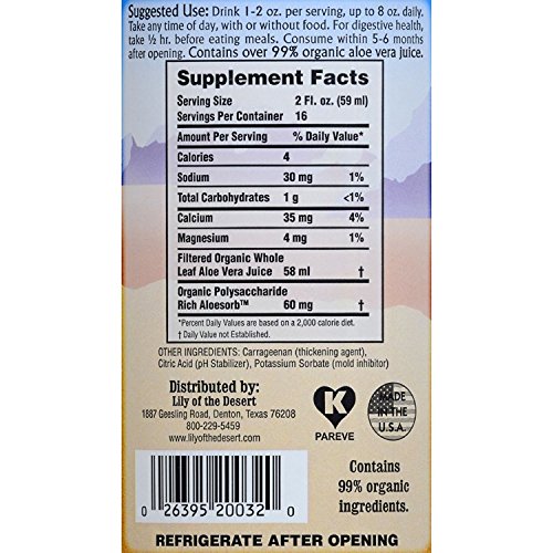 Studio : LILY OF THE DESERT Publisher : LILY OF THE DESERT Binding : Health and Beauty Product Description Lily of the Desert A Dietary Supplement Whole Leaf Aloe Vera Gel. (Filtered) ^. Enhanced with polysaccharide-rich. Certified. Aloe content purity in this product. International aloe science council. AloesorbTM. ^For consumer safety, aloin content is filtered to less than 1 ppm. 32 fl oz (one quart)/946 ml. 0