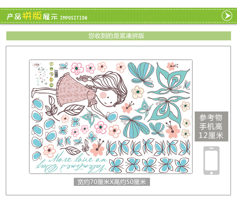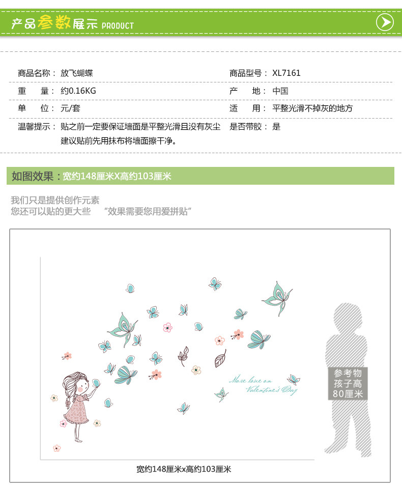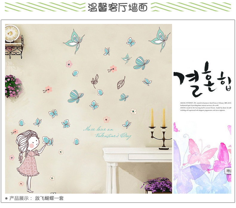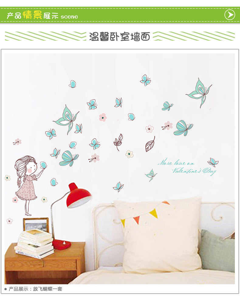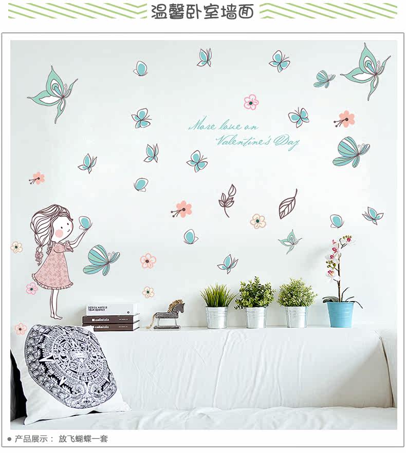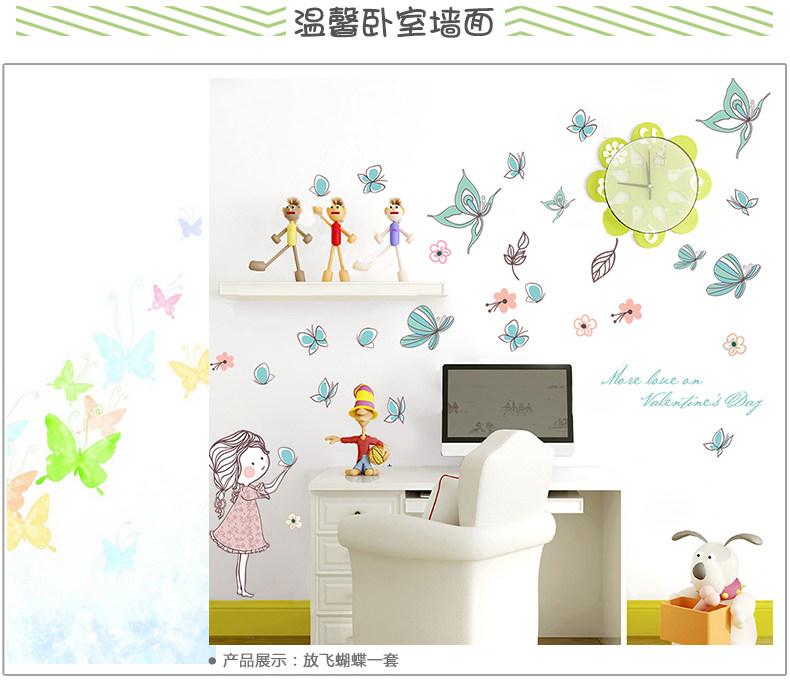 卡通女孩放飞的蝴蝶墙贴纸儿童房幼儿园宝宝卧室客厅布置自粘贴画