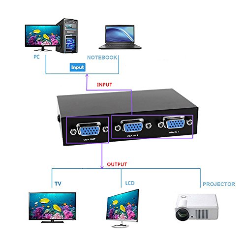 ★★★★★ FUNCTION: Input with PC/Notebook,Output with projector/LCD/TV. Supports VGA resolutions up to full HD 1920x1080 and WUXGA 1920x1440,Enables multiple PCs/laptops (or other VGA sources) to share one VGA monitor or projector ;APPLICATION: This VGA switch may be used in security setups where monitoring different areas of a building is required and switching between multiple inputs is a necessity , Ideal for presentations, classrooms, control center, remote monitoring & training facilities;