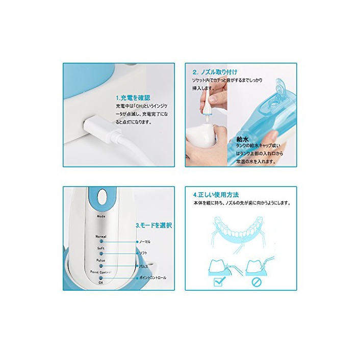 【4개의 모드에 치주병예방】제조 공예를 한층 더 갱신하고, 보다 안정인 수류를 제공 하고 있습니다. 당상품에서는 최신의 포인트 콘트롤 모드 탑재 만이 아니고, 3단계 수류「노멀,소프트,펄스」도 설정에 옵니다.주문인 모드를 선택해,치아의 뒤편이나 치사이에 가득찬 먹다 남은 찌꺼기를 없애고, 구취 치조농루치 주병을 효과적으로 예방합니다.