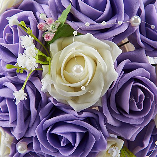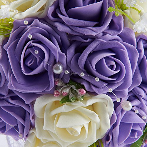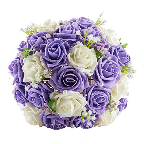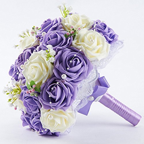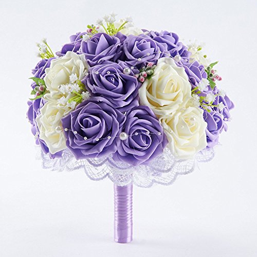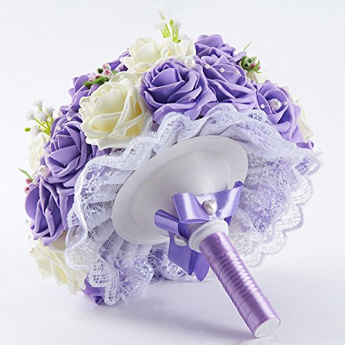 Sisjuly Lace Pearl Rose Holding Wedding Bridesmaid Bouquet with Flower(Purple+White)