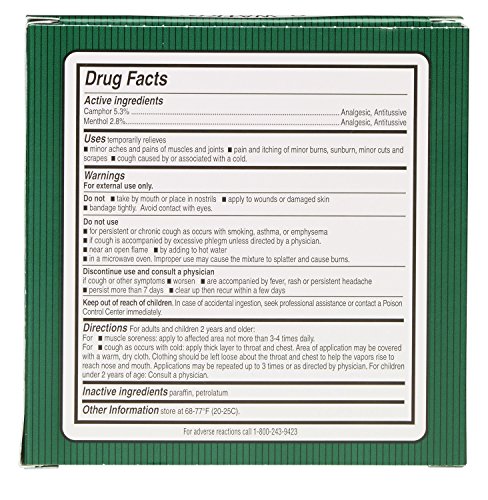 This cooling product helps relieve the congested feeling of a chest cold and suppresses the accompanying cough. The rub also provides temporary relief of arthritic and rheumatic pain, backache, sprains, strains, lumbago, and bruises.