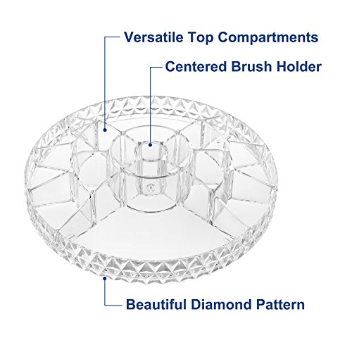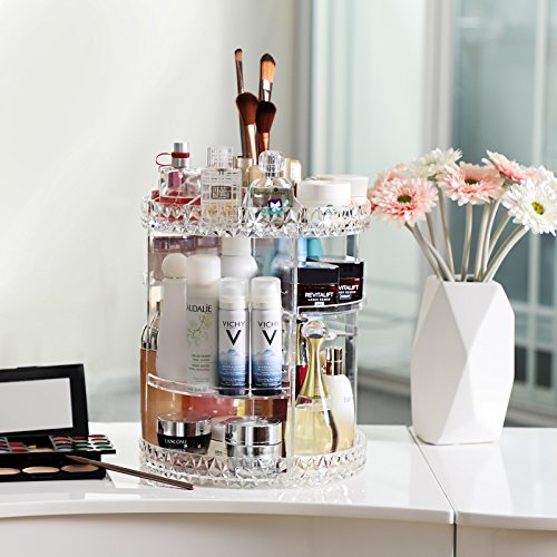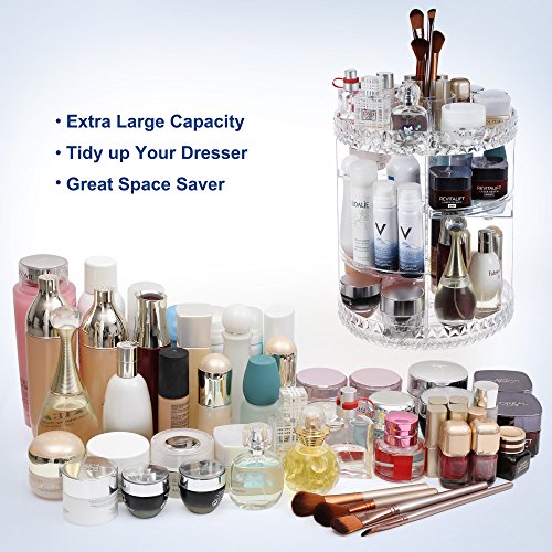 TIDY UP DRESSER: The extra large makeup organizer holds at least 20 brushes, 30 bottles of skincare products, 10 bottles of perfume; keeps counter clutter free; 10 5/8" x 13 3/4" (Dia. x H)