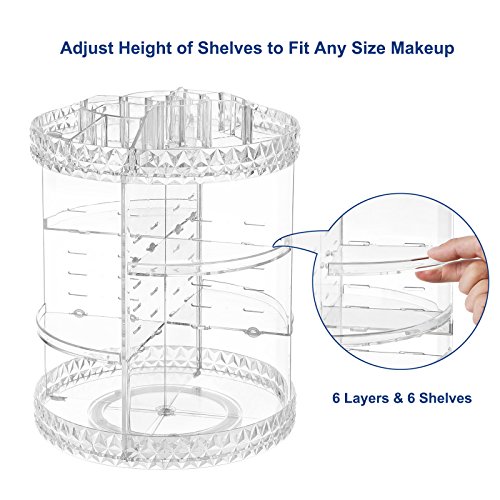 6 ADJUSTABLE SHELVES: You can adjust shelf height to fit all sizes of makeup and containers, maximum height is 11 1/8"; shelves are strong enough to hold even heavy cosmetics; Upgraded rubber ring is tough and not easy to be broken