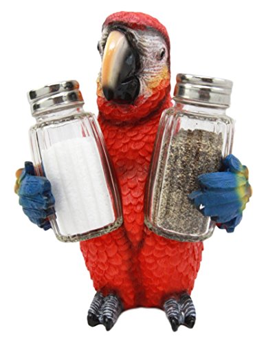 This is an adorable parrot salt pepper shaker holder figurine designed to grace your dining table, kitchen counter-tops and what have you. This scarlet macaw hugs the glass salt pepper shakers and he is of great assistance to you whenever you need the condiments. Bring the lively tropical rainforest ambiance into your home!