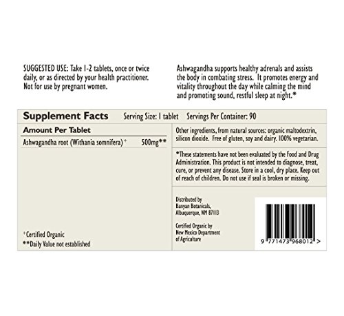 -. Binding : Health and Beauty -. Brand : Banyan Botanicals -. EAN : 0618192010211 -. Feature : Ashwagandha (Withania somnifera) has been used in Ayurveda for thousands of years as a ras?yana (rejuvenative) and an adaptogenic herb, meaning that it helps the body resist physiological and psychological stress. Ashwagandha is one of the most highly regarded and commonly used adaptogens in the Ayurvedic pharmacopoeia. / Maximizing the body's ability to resist stress, Ashwagandha enables the body to reserve and sustain vital energy throughout the day while promoting sound, restful sleep at night. It is considered one of the best herbs for calming vata and for revitalizing the male reproductive system. Used by both men and women, it maintains proper nourishment of the tissues, particularly muscle and bone, while supporting proper function of the adrenals. / This potent herb is used to promote muscle strength and to support comfortable joint movement. It is also used to maintain a healthy libido, for it is said to bestow upon its user the vitality and strength of a horse. As a rejuvenative, Ashwagandha is particularly useful to seniors and for anyone that would benefit from a nourishing, natural source of energy. / Banyan Botanicals is committed to producing the highest quality Ayurvedic products using USDA certified organic herbs that are sustainably sourced and fairly traded. All our products are 3rd party tested to ensure product quality and safety. / The Healthy Guarantee: If for any reason you are not satisfied with one of our products, we will gladly accept returns for a full product refund. -. IsAdultProduct : 0 -. Label : Banyan Botanicals -. LegalDisclaimer : These statements have not been evaluated by the Food and Drug Administration. This product is not intended to diagnose, treat, cure, or prevent any disease -. Manufacturer : Banyan Botanicals -. Model : Ashwaganda Organically Grown, 90 Tablets -. MPN : A1021 -. PackageQuantity : 1 -. PartNumber : A1021 -. ProductGroup : Health and Beauty -. ProductTypeName : HEALTH_PERSONAL_CARE -. Publisher : Banyan Botanicals -. Studio : Banyan Botanicals -. Title : Banyan Botanicals Ashwagandha Tablets - USDA Certified Organic, 90 Count, Adaptogenic Ayurvedic Herbal Supplement That Promotes Vitality & Strength - Support for Stress-free Living! -. UPC : 618192010211