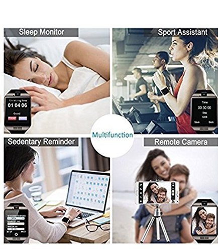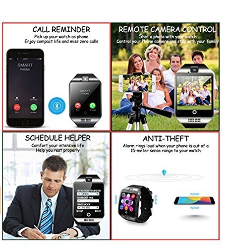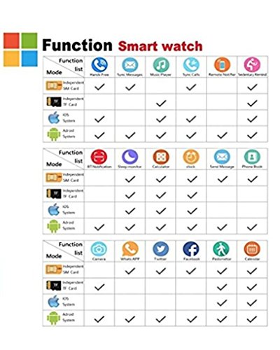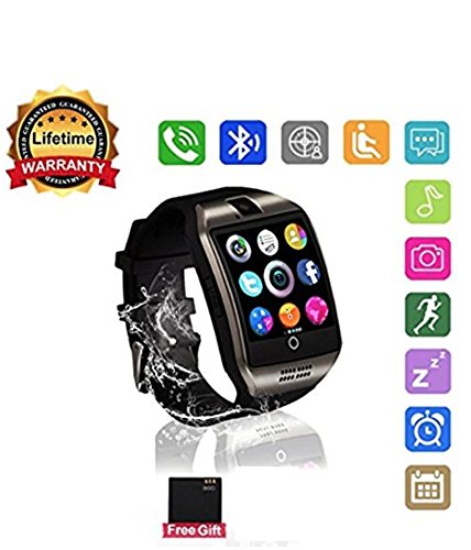 -. Feature : ***Works Over Your Expectation***Easy to connect to your smartphone and Speaker phone. Listen to music and make calls from your watch Freely. / ***Multi-Function***Dial via watch SIM or Bluetooth optional, Pedometer, Calories Calculation, Sedentary remind, Sleep monitoring, Remote photos, Music playing, Alarm clock, Saving time and notification push including Facebook, Twitter, Email, etc. For ANDROID, all functions can be used. For IPHONE, the smartwatch supports Partial Functions. (Please See the Function Chart before you place order) / ***Long-Lasting Battery life*** 500mAH lithium battery, average using time is 2 days.We also give you one extra Battery as a Gift. Never worry about out of battery problem / ***Wearing More Comfortable***Stainless steel surface, Precision laminating process, Nano TPU85 material strap, anti-sweat matte surface treatment, ergonomic convex design and soft strap which make wearing more comfortable. Life Waterproof, for example, the smart watch surface can resist rainwater. / ***What You Get*** One piece Q18 Free Battery and Lifetime worry-free product guarantee which ensure long-lasting enjoyment of your smartwatch