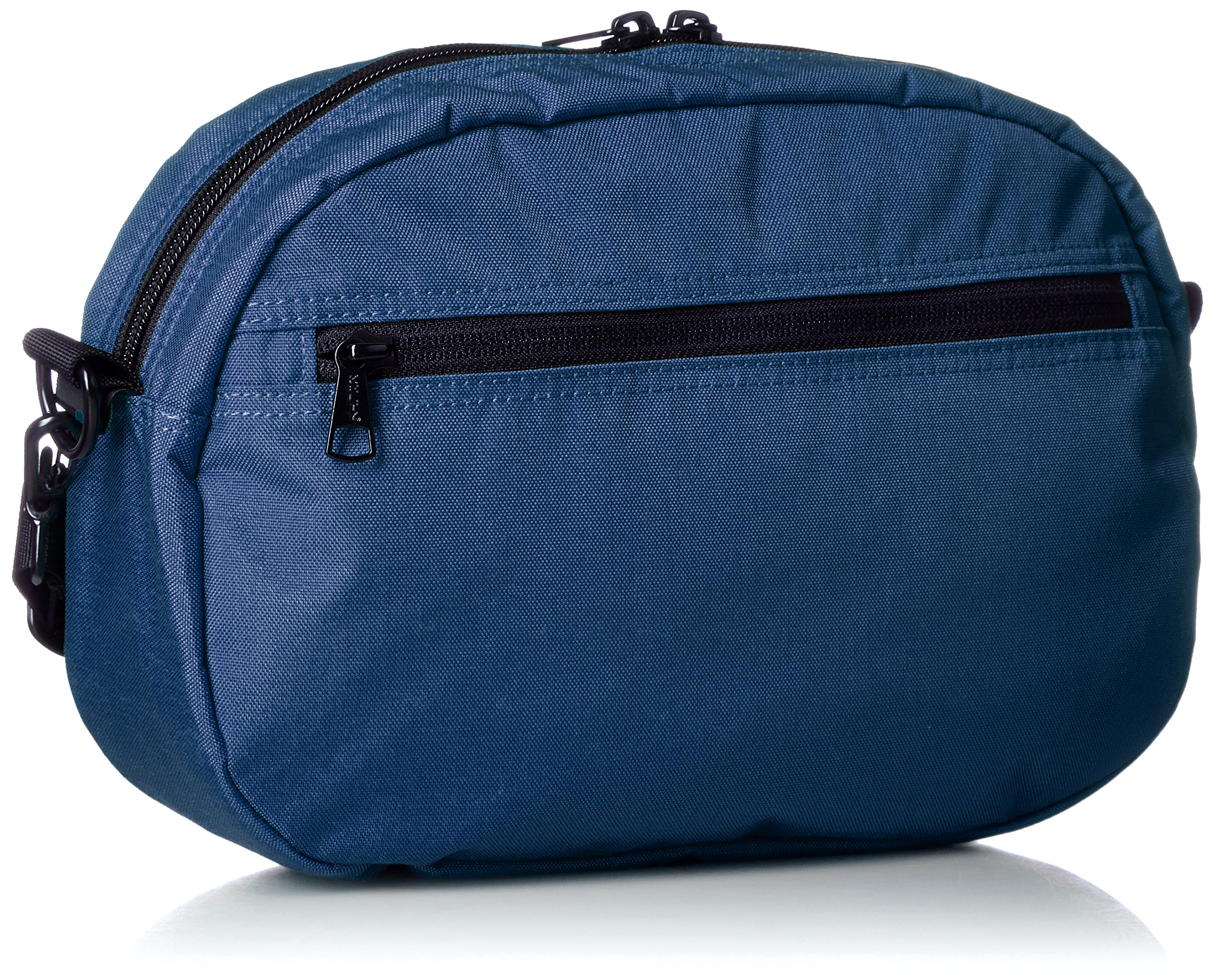 Zip pocket on the front, mini shoulder with mesh pocket on the inside.