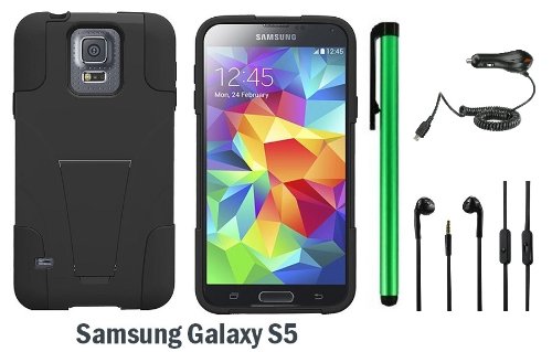 - Feature : Perfect fit for Samsung Galaxy S5 / Premium T-Stand Cover Protector Case + 3.5MM Stereo Earphones + Car Charger + Metal Stylus Touch Screen Pen / Made of High Quality Durable Plastic Material / 1 of Random Color 3.5MM Stereo Earphones (Random color- Black, White, Green, Pink, Purple, Blue; Premium sound quality, Compact size, and Sleek design; Excellent sound quality and super clear sound; Keep your hands free and on the wheel when driving) / 1 of New Metal Stylus Touch Screen Pen (4" Height, Random Color- Black, Silver, Hot Pink, Green, Light Green, Red, Blue, Light Blue, Purple and Gold)