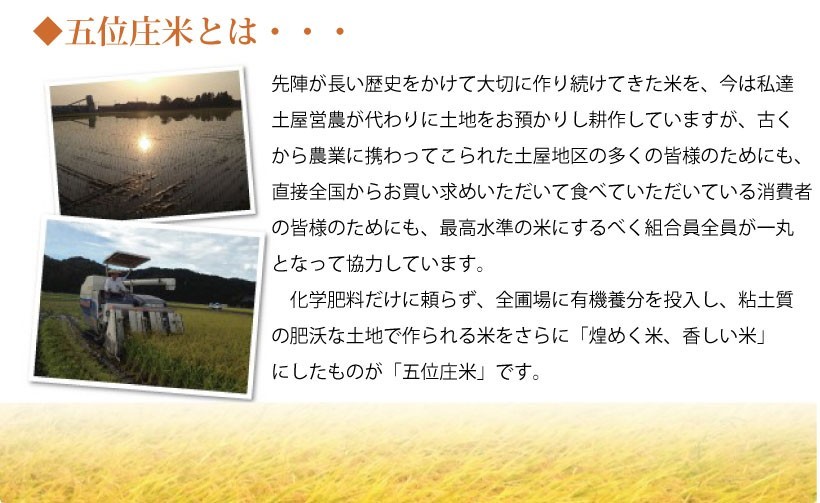 粘土質の肥沃な土地で作られる米をさらに「煌めく米、香しい米」にしたものが「五位庄米」です!!