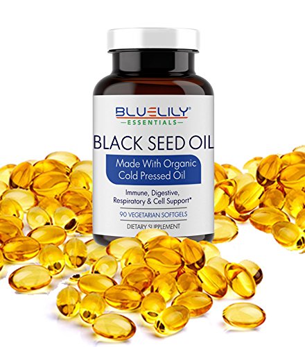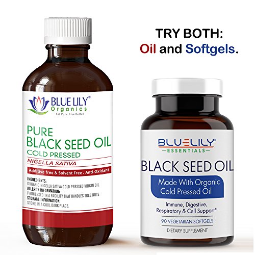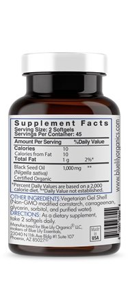 -. Feature : 90 Vegan Softgels - Our 100% Pure Black Seed (Nigella Sativa) Oil capsules are a rich source of unsaturated essential fatty acids and offer many nutritional benefits for good health. The softgel capsules provide a convenient way to take a consistent amount of Black Seed oil without the distinctive taste of the oil. / Black Seed Oil softgel capsules have been attributed to 4 main components, viz. thymoquinone, carvacrol, tanethole and 4-terpineol, which demonstrated respectable radical scavenging (anti-oxidant) properties. It has several benefits for skin as well. It is useful in fungal infections. The oil helps in repairing and rejuvenating damaged skin. / 100% Purity Guaranteed: Black Seed oil contains two powerful phytochemicals Dithymoquinone and Thymoquinone (Thymoquinone is a phytochemical compound found in the plant Nigella sativa.) which support the body's various functions. / 100% Risk Free Purchase - Purchase with complete peace of mind. We offer a full 100% 30 day money back guarantee. If you are not satisfied with your purchase, we will refund your entire purchase. / Also available: Black cumin seed oil, 8 fl oz, pure certified organic. Search for Blue Lily Organics Black Cumin Seed Oil