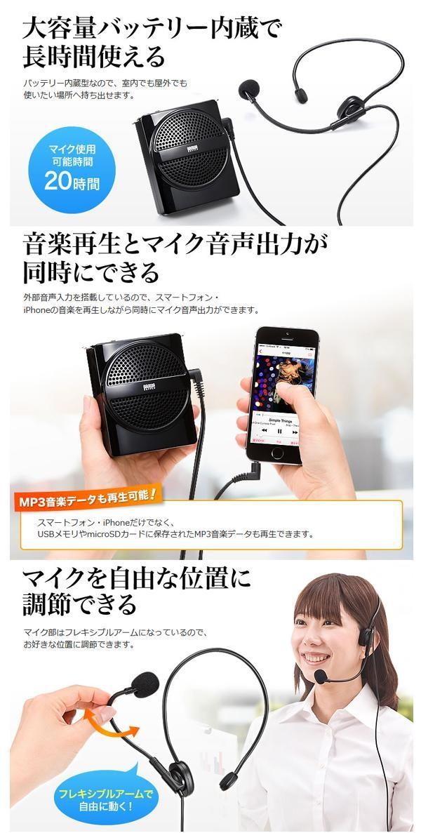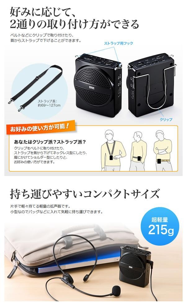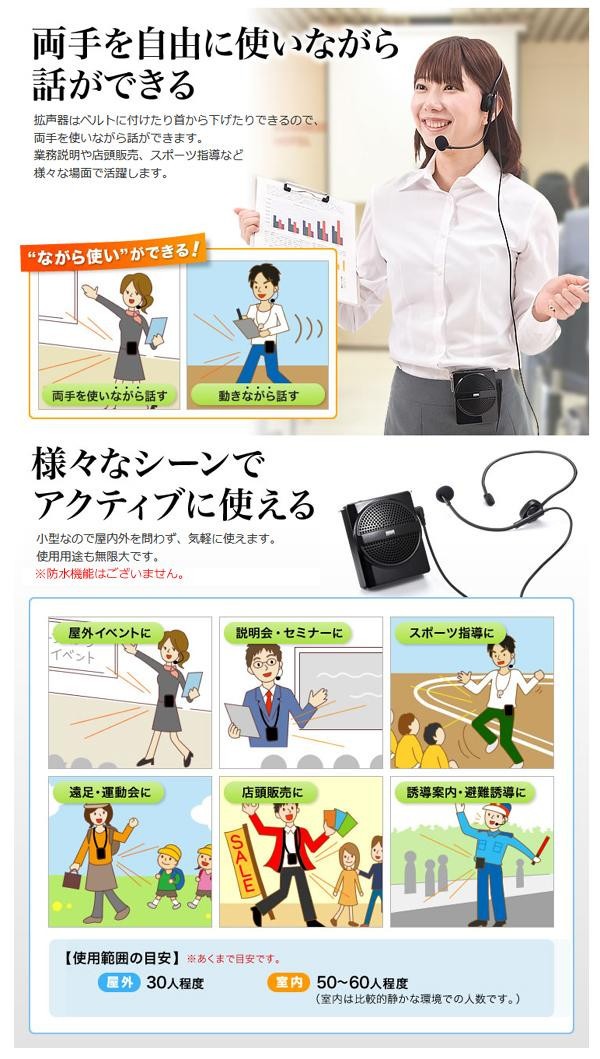 体にスピーカーとヘッドマイクを装着することで両手が自由に使えるハンズフリー拡声器スピーカーです。軽量でコンパクトサイズなので、ツアーガイドやイベント、講義や店頭販売など様々なシーンでアクティブに使用することができます。 |