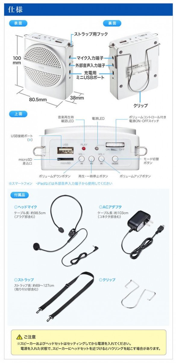 | 両手が自由に使えるハンズフリー拡声器スピーカー。 |