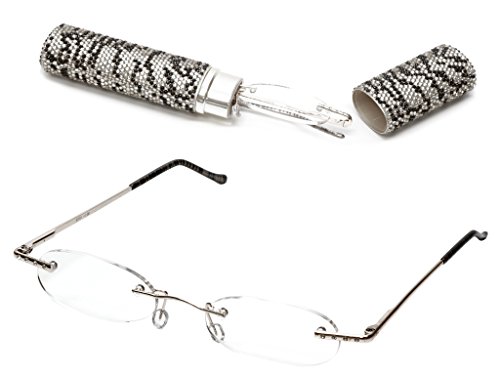 Product Description Stylish and portable, Calavria's Diamond Diva tube readers add extra flare to your pocket readers. With a rimless oval design, spring hinges for added comfort, aluminum tube case, these may be the only readers you need! Case is completey covered in rhinestones with a color that matches the light weight frames. Frames measure 5.12" wide, 0.87" high. 0