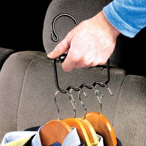 Versatile car hanger multiplies hanging capacity and turns a back seat garment hook or grab handle into a portable mini clothes closet