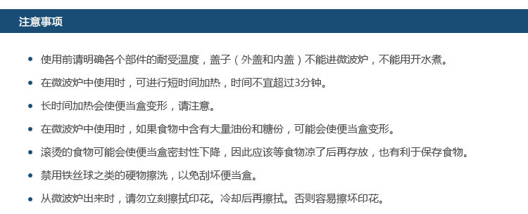 注意事项:微波时两个盖子不能进微波炉。不宜长时间加热,一般高火微波不超过3分钟为宜。不可用铁丝球之类的洗碗布清洗。刚烧好的菜勿立即装盒。
