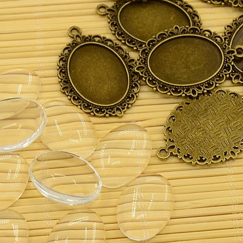 Pandahall 10sets DIY Pendant Making Tibetan Style Pendant Cabochon Settings and 18x25x5.4mm Oval Transparent Clear Glass Cabochons