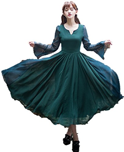 -. Title : シフォンドレス ロング丈 スウィングレトロ パゴダスリーブ ホーンスリーブ フレアスカート Vネック 長袖 マキシ丈 ウエストスリム エレガント 春秋 クマのぬいぐるみ付き K-2535