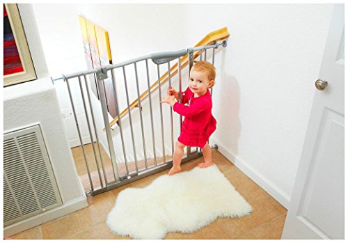 - Feature : Metal Safety Gate is great for Pets or children from 6 to 24 months and can be used to make stairs safe by using the mounting cups that are included. / One-hand operation for easy use. 100% auto close and comes with color coded indicator line to show open or closed positions. / Open in 2 directions (ways) for easy walk-through. Can be Locked in open position for easy access. Double motion and double locks for more security. Pressure-mounting prevents wall damage or permanent mounting cups are included when using for stairs. / Makes a great room barrier for child or pets Pewter color to fit modern decors.. / Complies with ASTM F 1004. This SG 35-4 Gate comes with four extensions that increases the opening size by 3.54" or 9 cm for each one and will fit openings from 44.88"-47.24" or 114-120 cm. Extra tall Height: 33.6" (85.4 cm)