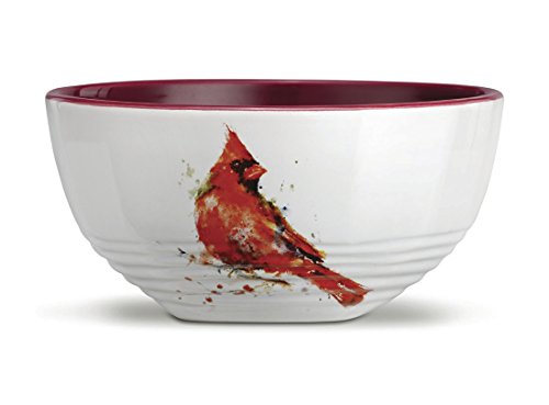 From the Big Sky Carvers Dean Crouser Collection, Redhead Cardinal stoneware soup bowl. 6"D x 3"H Dishwasher safe, Microwave safe. The watercolor paintings featuring wildlife are vibrant, colorful, and full of energy. This collection by Dean Crouser highlights the most popular animals accentuated against a pure white background with ripples of texture through the design. Interior of the bowl is red.Feature