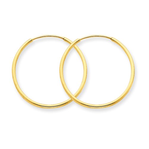 Our classic hoop earrings fashioned from polished 14k yellow gold are available in a variety of sizes to suit your fashion needs. They feature an endless, hollow tube design that is 1.25mm thick and this pair is approximately 28mm (1 1/10 inch) in diameter.Feature