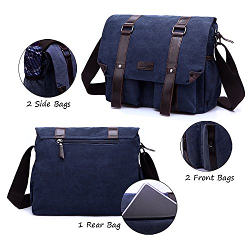 -. Feature : Canvas Messenger Bag / Strengthened shoulder straps; Adjustable buckle shoulder; Mental magnetic buckle; Flap cover with leather trim / Structure- 2x Delicate Front Pockets; 1x Main Pocket: one inner zipper pocket, two inner small pockets; 2x Side Pockets; 1x Back Pocket / Measures(L*H*W): 12.6''x 11.4'' x 4.7'' (32cm x 29cmx 12cm); Fits 15'' Laptop / Good bag for travel, hiking, camping, outdoor, shopping, business, school, daily life, etc.