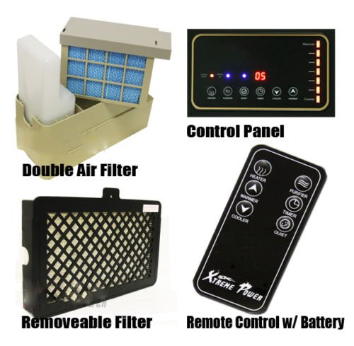Specifications: 120V/60Hz 1500W Up to 5600BTU Noise Level 25-42db Coverage up to 1000 sqf 60-90 Degree IR remote Control included High efficient HEPA filter remove 99.5% of particles as small as 0.3 microns in size. The Plasma ION generator attacks airborne pollutants at the molecular level The PCO system removes offensive odors from the room while killing harmful germs and bacteria to create a purified, healthy and comfortable breathing enviroment The fan can transmit water vapor into air to make you feel more comfortable Overheat safe cut out, safe tip over switch Package Contents: 1 x Space Quartz Heater with Remoter