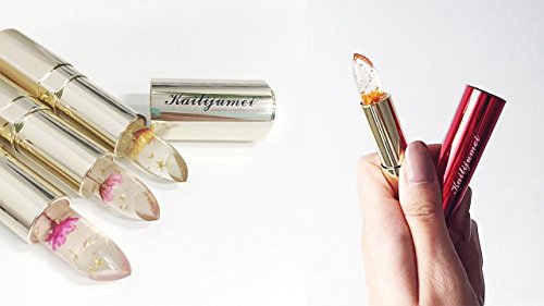Feature : 1. Clear, gold-flaked jelly lipsticks, each one featuring a tiny dried flower inside. / 2. Once it is applied to lips, the clear jelly lipstick transforms into a lovely transparent pink gloss. / 3. The color may change depending on your body temperature, staying lighter if you are cool, and deeper if you are warm. / 4. Each lipstick has a pleasant fruity scent and is housed in a deluxe signature red metallic tube with mirror on one side / 5. Ingredients: Candelila Resin, Cocoa Butter, Plant Extract, Stearic Alcohol (HALAL), Olive oil, Citric Acid, Grape Seed Oil, Lavender oil (4 Kind of Dried Flowers - NON Poisonous).ALL OUR KAILIJUMEI LIPSTICKS ARE MADE CRUELTY- FREE (NOT TESTED ON ANIMALS 100%).