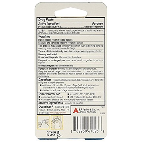 Studio : Everready First Aid Publisher : Everready First Aid Binding : Health and Beauty Product Description Relieve your stuffy nose and sinus pressure with the Benzedrex vapor Inhaler. This nasal decongestant provides temporary relief of nasal congestion caused by sinusitis, hay fever or the common cold. Specially formulated with propylhexedrine, lavender oil, and menthol, Benzedrex promotes nasal and sinus drainage and temporarily relieves sinus pressure. 0