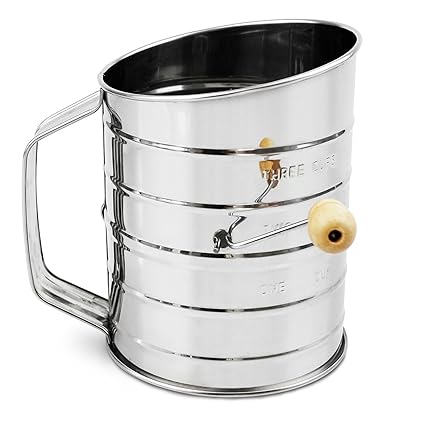 - 100% durable stainless steel with a crafted wooden knob crank handle which passes a rotary blade across a fine mesh sieve which is a high quality sifter screen for thorough sifting. Ensures an equal consistency and standard measure in baked goods.