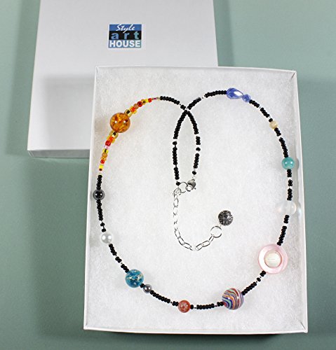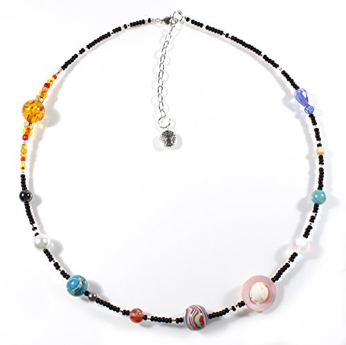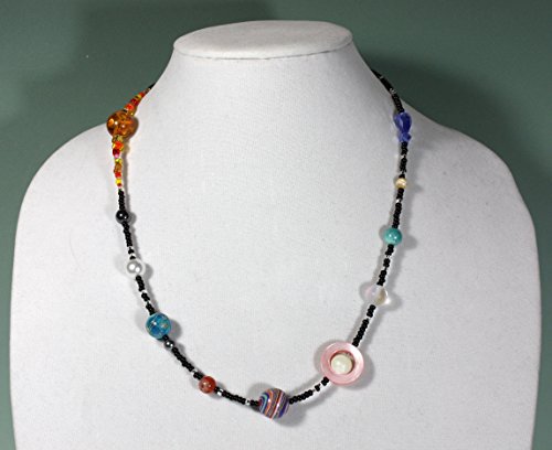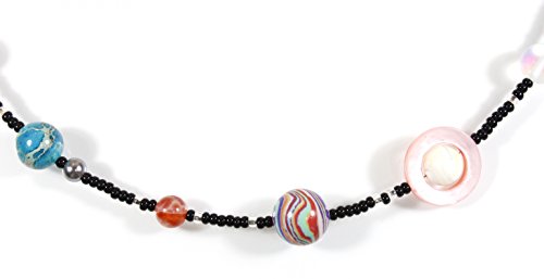 This is the coolest necklace for someone who likes astronomy! Here we have the nine planets laid out in beads: Mercury, Venus, Earth and Moon, Mars, Jupiter, Saturn, Neptune, Uranus, and yes, Pluto; tiny black beads represent outer space with tiny shiny silvertone beads representing the stars!