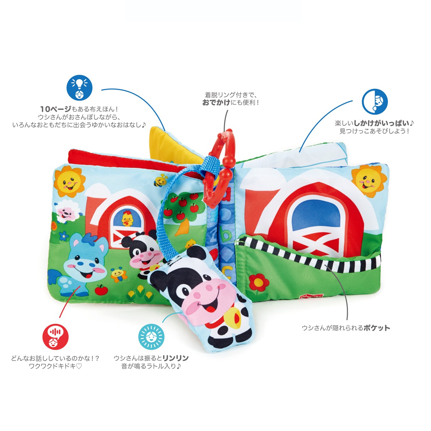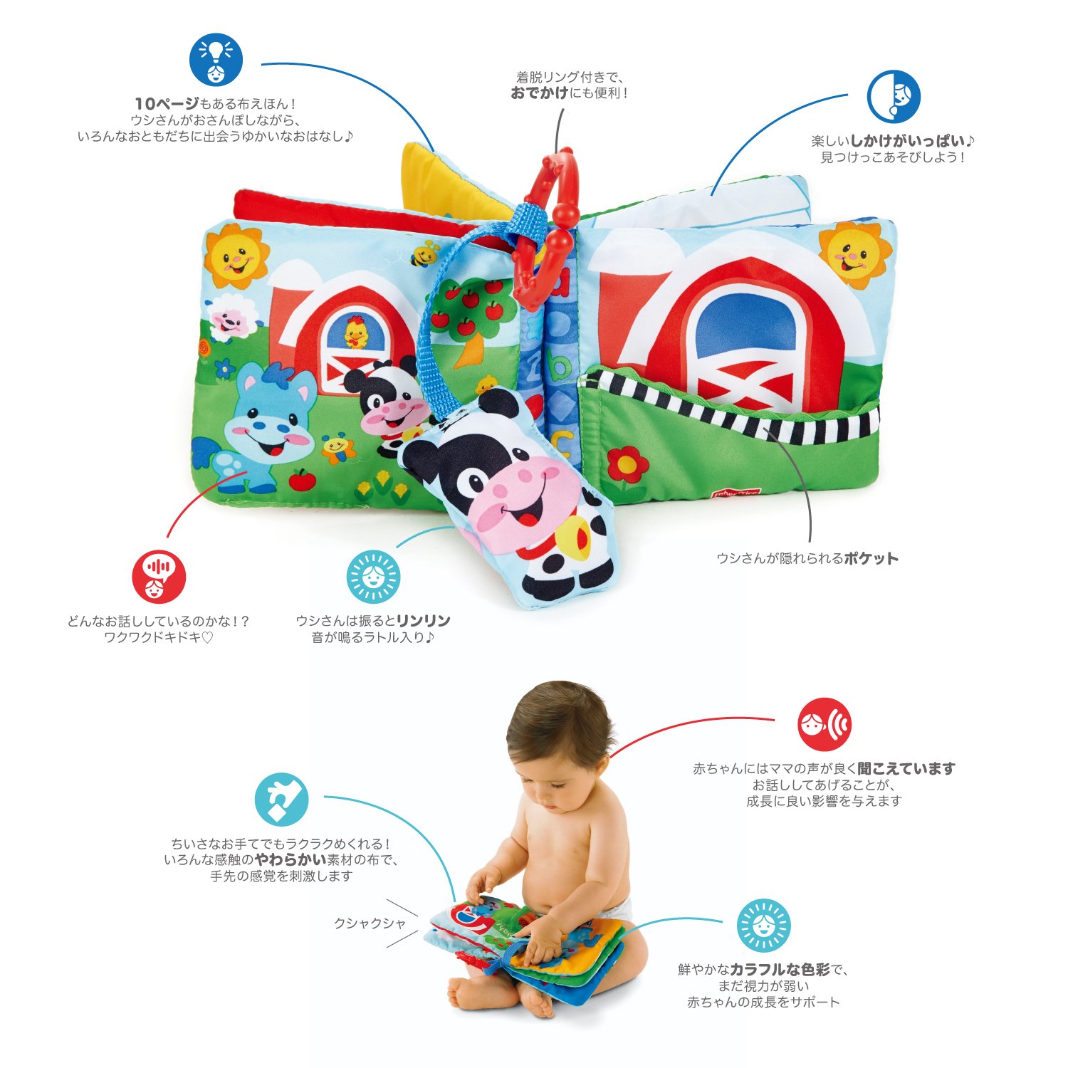 種類:単品小さなウシさんが絵本の中をおさんぽしながら、おともだちに出会うゆかいなお話し!小さな扉をめくると、赤ちゃんの大好きな見つけっこ遊びができるカラフルなやわらか布絵本です。いろいろな布の感触も楽しめます。ミニサイズなのに10ページもあり読み応えたっぷり!どうぶつさんがたくさん登場するので、赤ちゃんにどうぶつの名前を教えてあげましょう。ウシさんはふると音が鳴るラトル入り!おでかけにも便利な着脱リング付き。